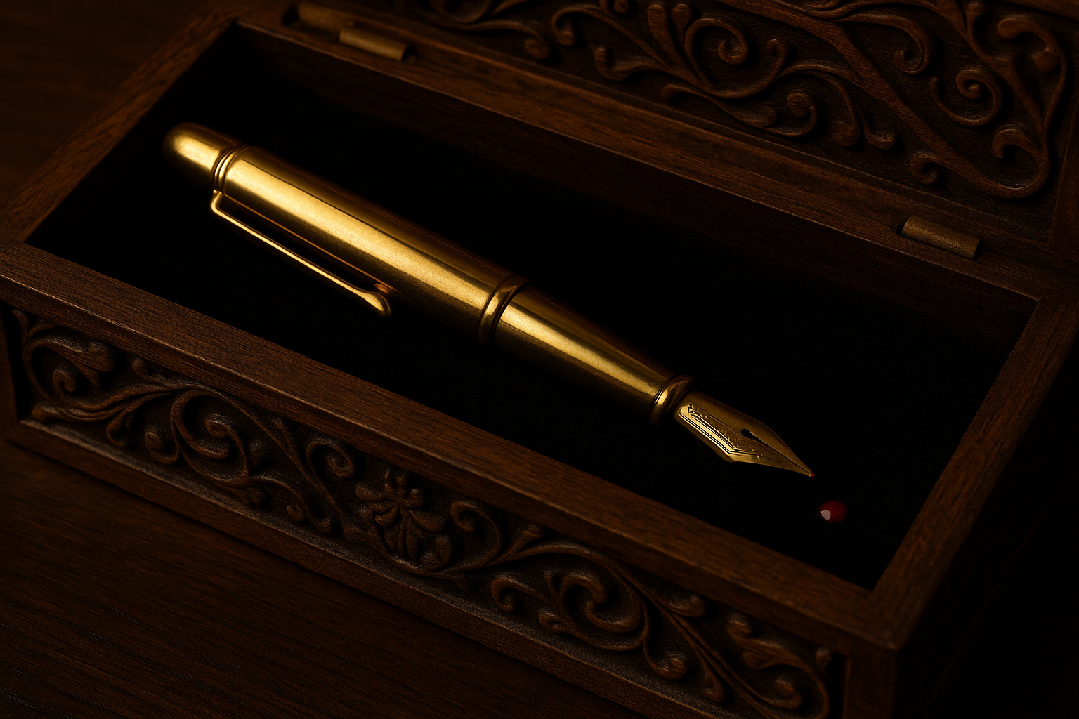 Laura was sorting through her grandmother’s things when she found the pen. It was a gold-plated pen nestled in velvet inside an elaborately carved wooden case. The carvings were odd, the ends seeming to flow together until it was hard to tell where one figure ended and the next began.